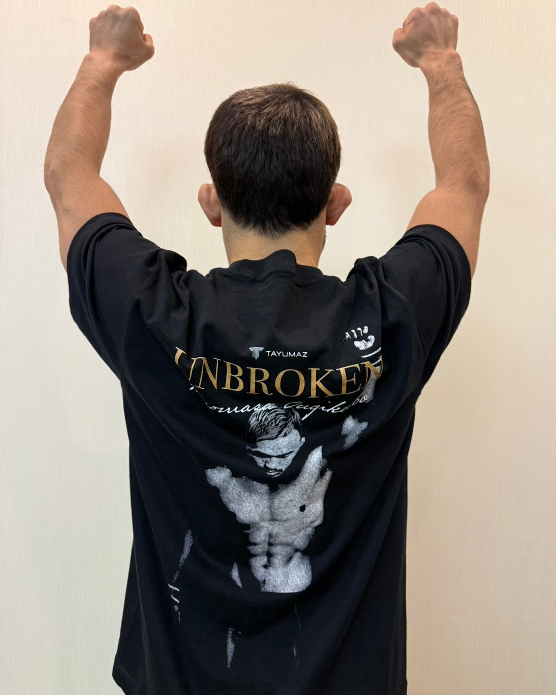 闇の中から浮かび上がるようなモノクロームの肉体美と、揺るぎない信念を表すゴールドのタイポグラフィ。 単なる応援グッズの枠を超え、着る人の心にも「折れない強さ」を宿す一枚に仕上がりました。