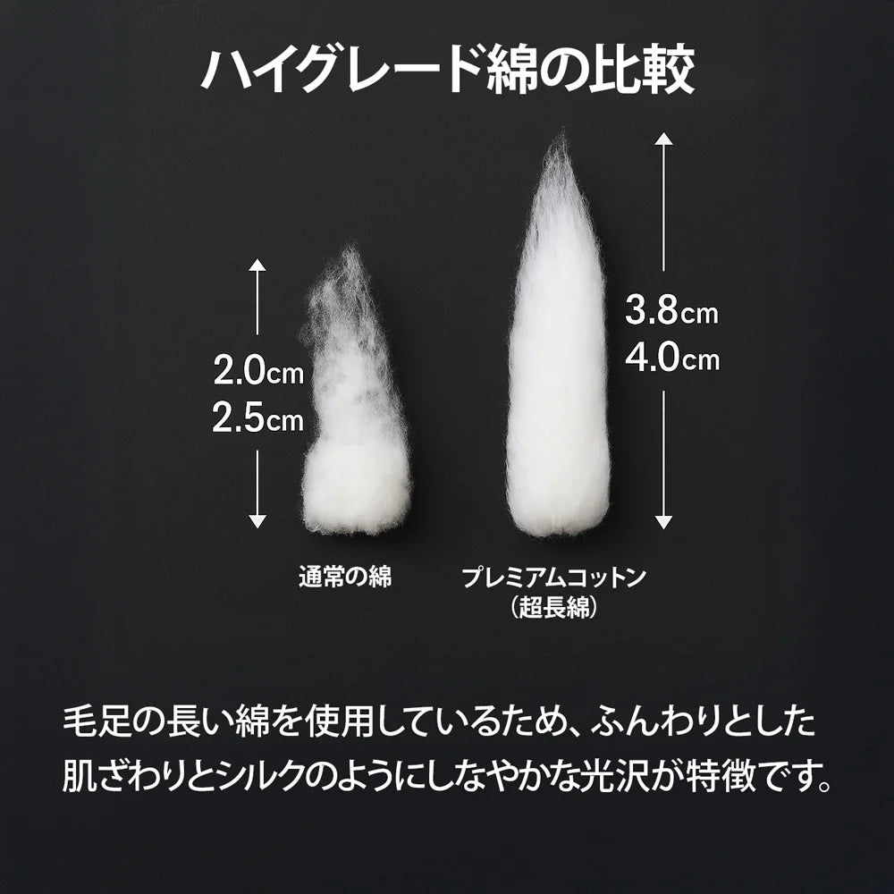 通常の綿糸よりも天然の油脂分が多い最高級の綿糸を採用した、しなやかな風合いと肌触りのよい快適な着心地です。プレミアムコットンは毛足(繊維)がとても長いため、ふんわりなめらかな仕上がりです。