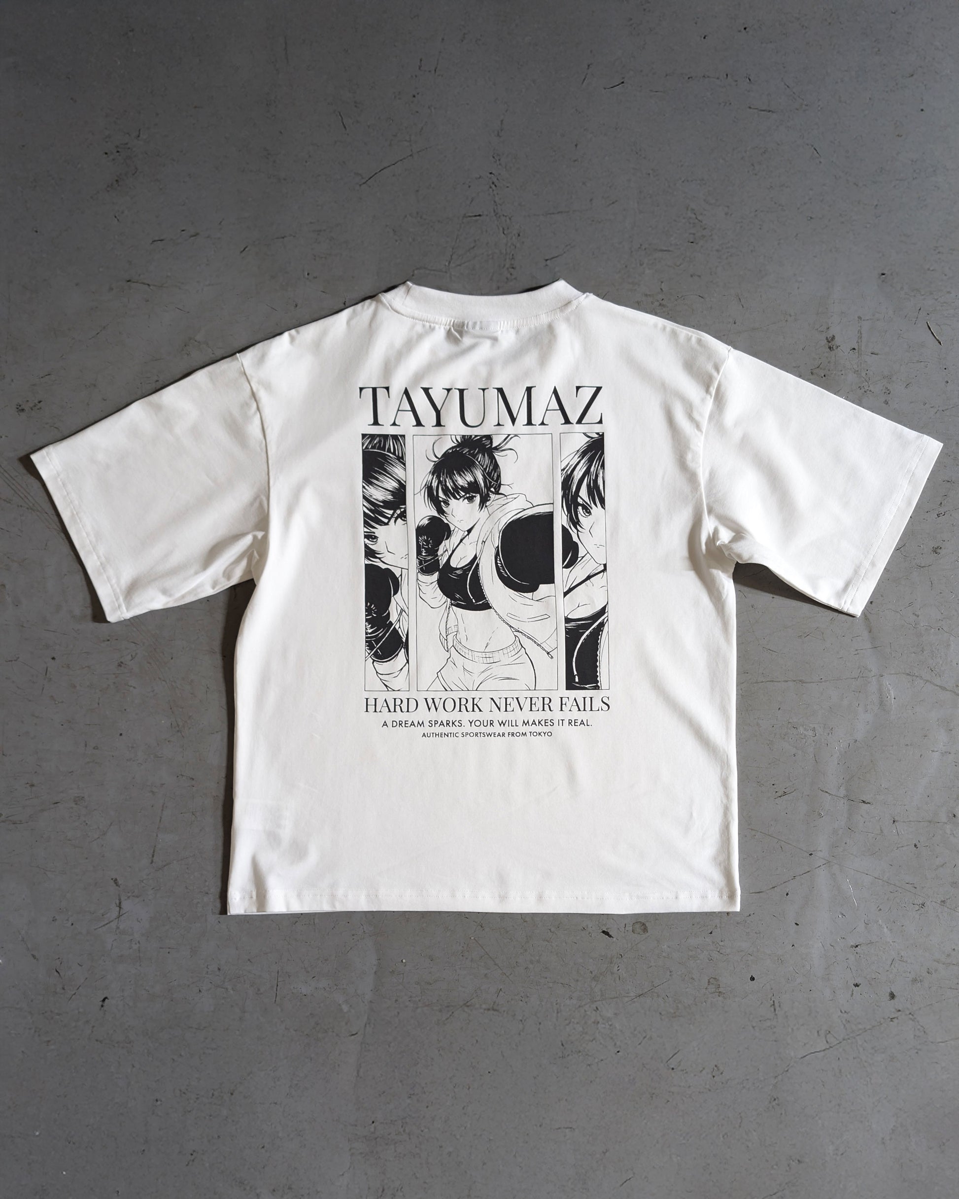 グローブをはめ、鋭い眼差しで未来を見据える女性ファイターの姿は、TAYUMAZが提唱する「不屈の精神」を象徴しています。