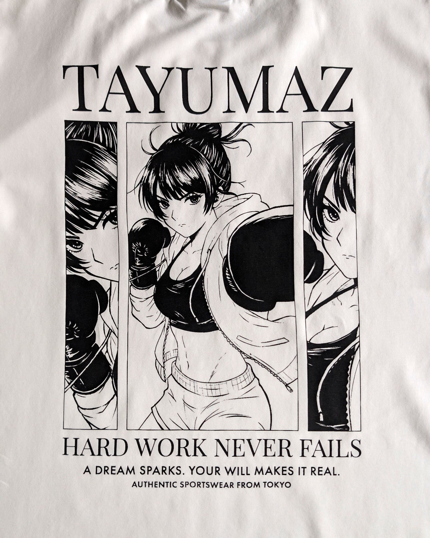 タイポグラフィの調和: 上部にはクラシックなセリフ体の「TAYUMAZ」ロゴ、下部には不動のメッセージ「HARD WORK NEVER FAILS」を配置。アート性の高いイラストを、格調高いタイポグラフィが引き締めます。